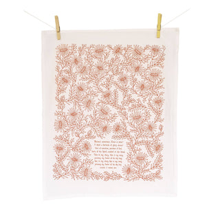 Our hymn tea towels brighten your home with color and song. The Blessed Assurance hymn tea towel is printed in rust and features lyrics from the hymn accented by intricate floral design. Made of 100% cotton, these flour sack tea towels easily and cost-effectively replace disposable paper towels with high absorbency and durability. Generously sized, lint free, and made to last a lifetime. Illustrated by Kate Whitley. • 24″L x 20″W • Folded and wrapped with a matching belly band • Machine-washable, 100% cotton • Screen printed in Mt. Juliet, Tennessee • Made in USA
