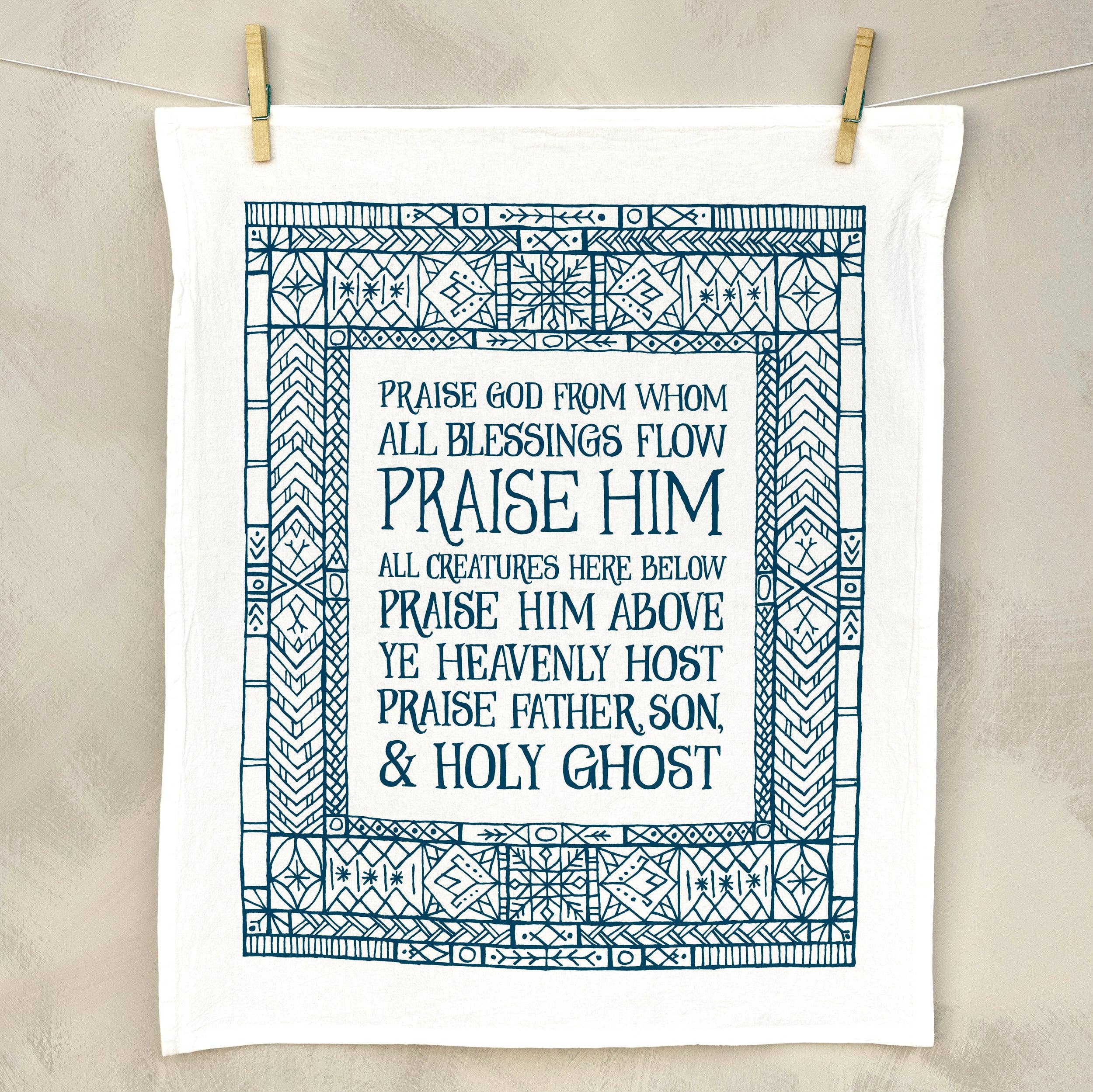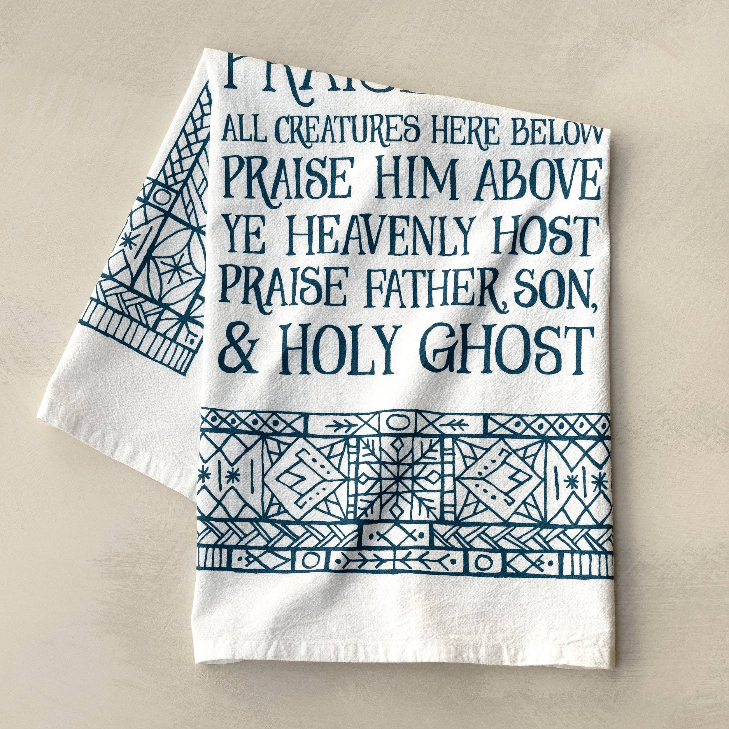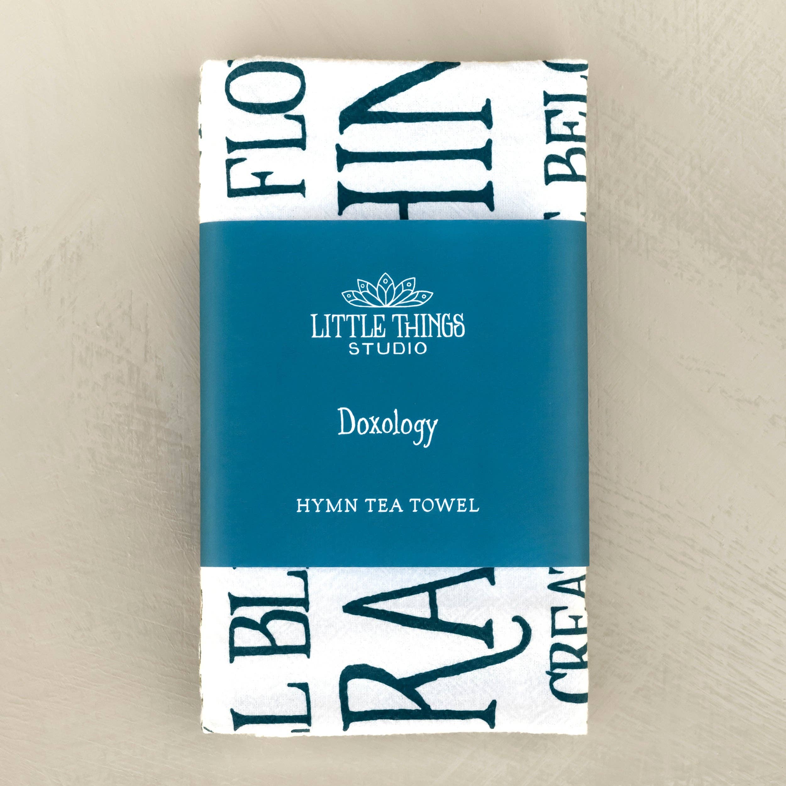 Our hymn tea towels brighten your home with color and song. The Doxology hymn tea towel is printed in peacock blue and features lyrics from the hymn. Made of 100% cotton, these flour sack tea towels easily and cost-effectively replace disposable paper towels with high absorbency and durability. Generously sized, lint free, and made to last a lifetime. Illustrated by Kate Whitley. * 24″L x 20″W * Folded and wrapped with a matching belly band * Machine-washable, 100% cotton * Made in USA