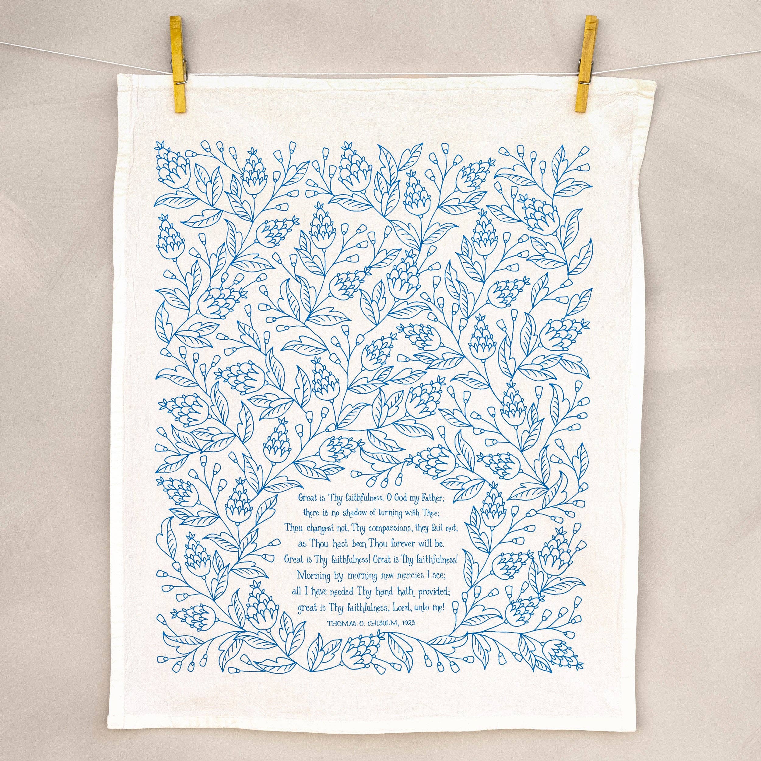 Brighten your home with color and song. The Great Is Thy Faithfulness hymn tea towel is printed in cerulean blue and features lyrics from the hymn. Made of 100% cotton, these flour sack tea towels easily and cost-effectively replace disposable paper towels with high absorbency and durability. Or use as curtains or a wall display. Generously sized, lint free, and made to last a lifetime. Perfect for gift giving. Illustrated by Kate Whitley. * 24″L x 20″W * Folded and wrapped with a matching belly band * Machine-washable, 100% cotton * Made in USA