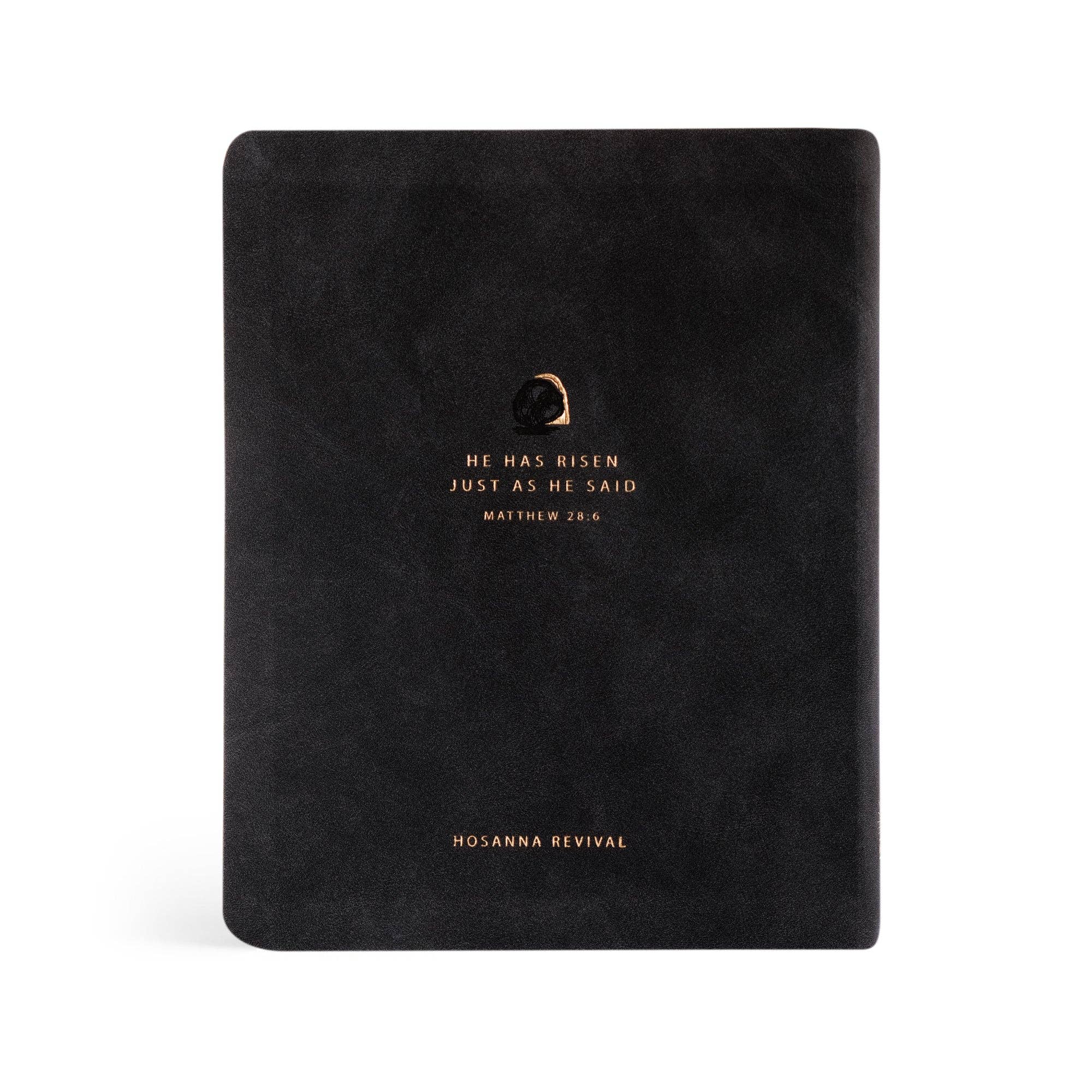 This black leather-like Bible is based on the beloved city of Jerusalem in Israel, where history unfolds in the Old and New Testaments and where the last week of Jesus’s life was spent. May we never forget the unashamed, powerful ministry that took place in the city that saw Jesus's arrest, trial, crucifixion, entombment, and resurrection. A gold-foiled design of Jesus’s open tomb is placed on the cover of this Bible, symbolizing his victory over death and defeating every act of evil that has ever been and will ever be. The back of the Bible features Matthew 28:6, “He has risen just as he said,” a verse that declares the power and sovereignty of God.