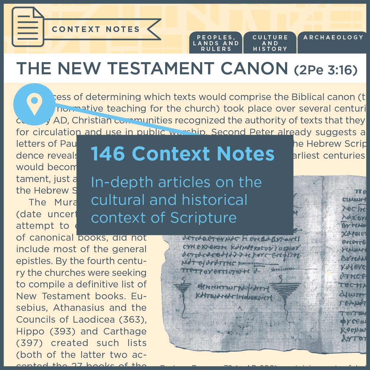 • 146 Context Notes: In-depth articles on the cultural and historical context of Scripture