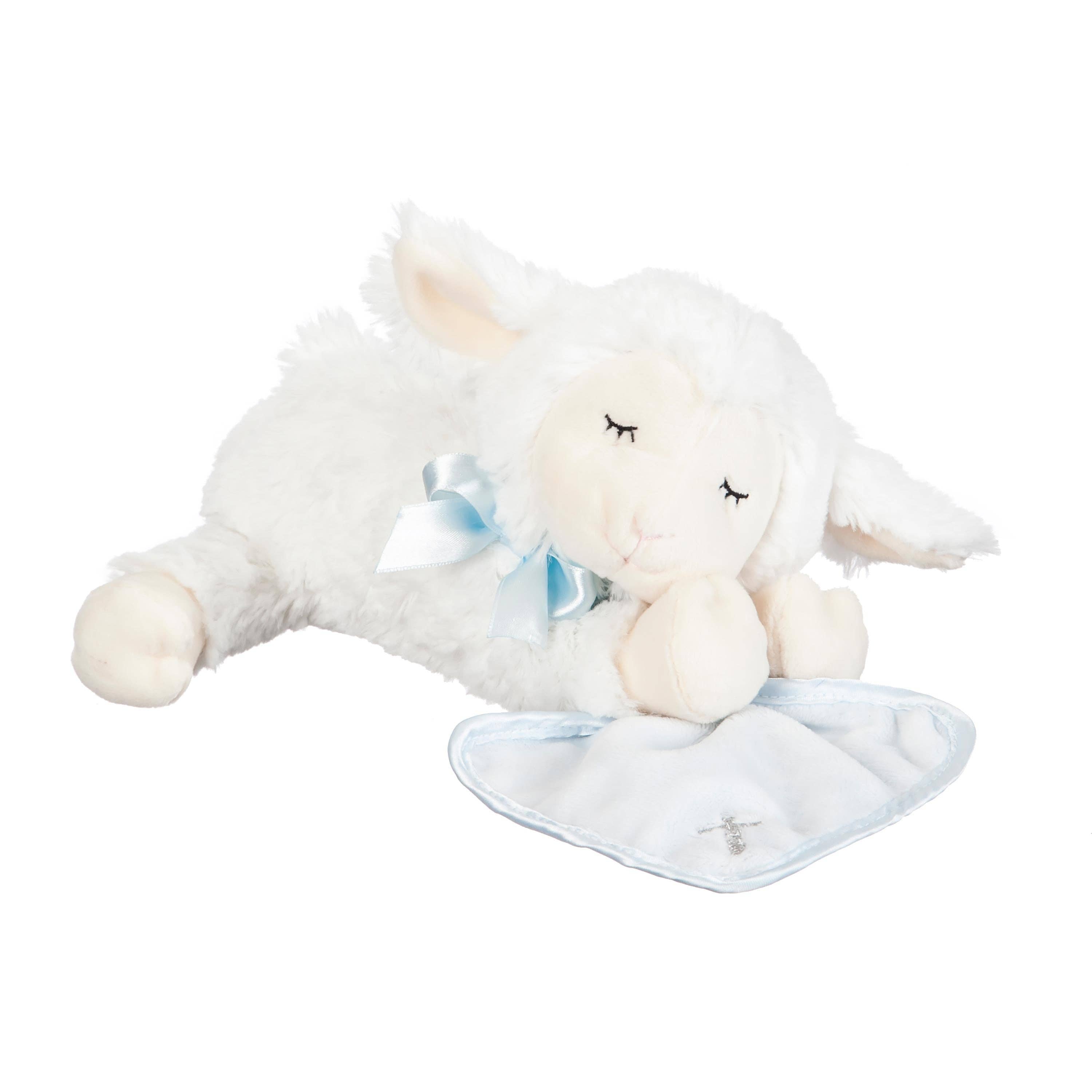 Introduce your little one to the importance of prayer with the help of this sweet stuffed lamb. The precious plush is the perfect naptime companion and holds a soft blue blanket adorned with a delicate cross. Press its tummy to hear an audio recording of "Now I Lay Me Down to Sleep."This special set is a great gift for parents-to-be or newborns. Spot clean only. 100% polyester.