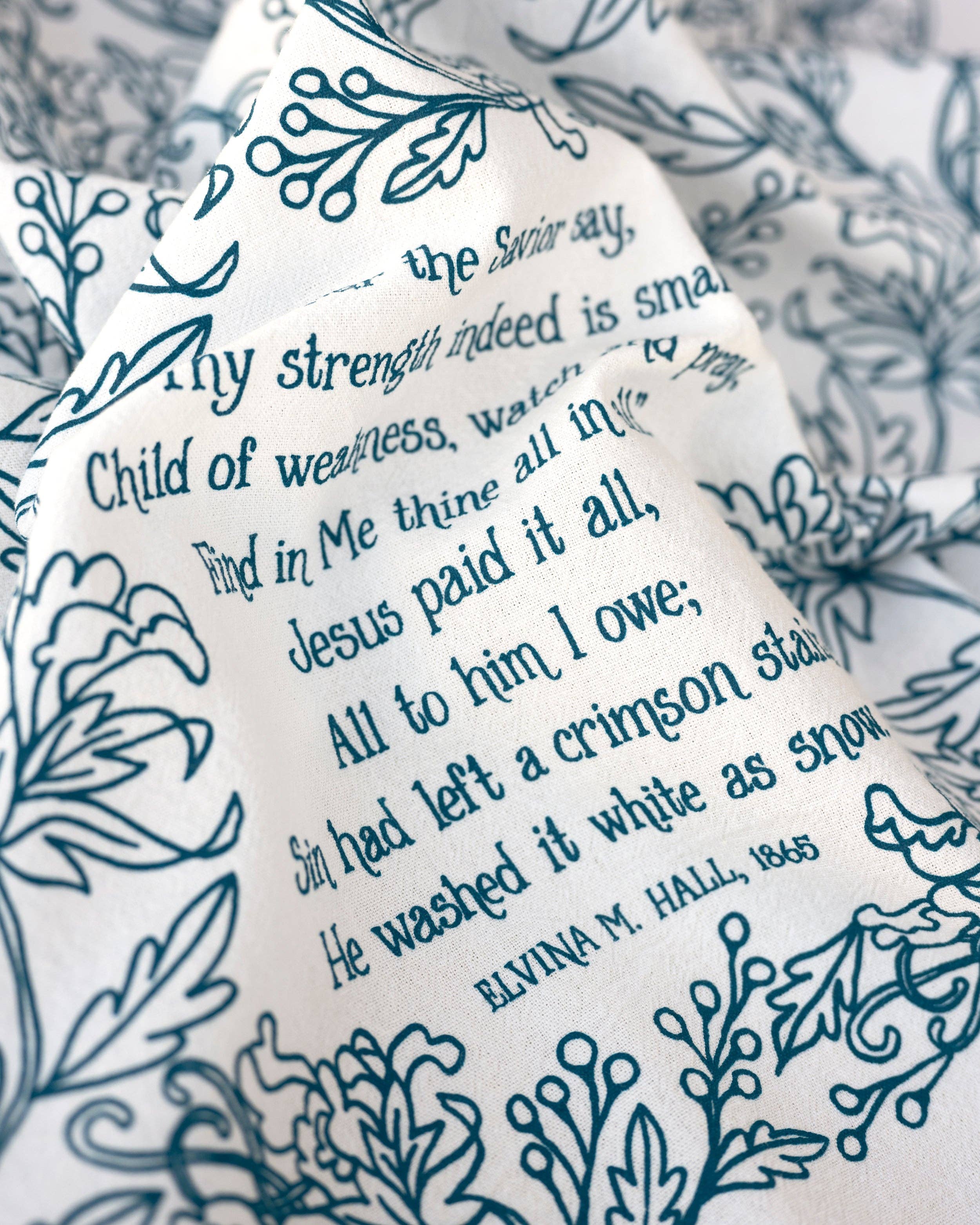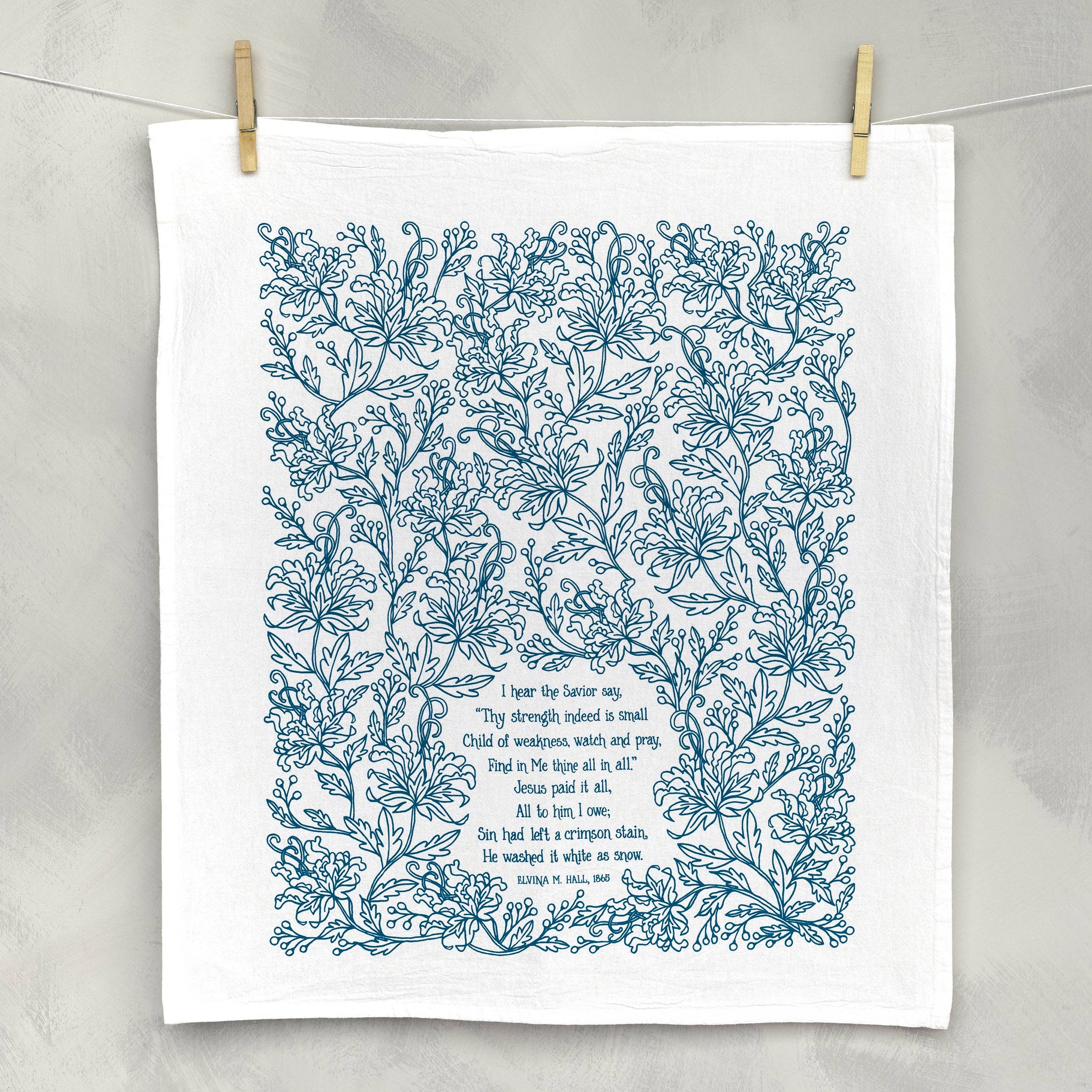 Brighten your home with truth and song. The Jesus Paid It All hymn tea towel is printed in blue and features lyrics from the beloved hymn. Made of 100% cotton, these flour sack tea towels easily and cost-effectively replace disposable paper towels with high absorbency and durability. Or use as curtains or a wall display. Generously sized, lint free, and made to last a lifetime. Perfect for gift giving. Illustrated by Kate Whitley. * 24″L x 20″W * Folded and wrapped with a matching belly band * Machine-washable, 100% cotton * Screen printed in Mt. Juliet, Tennessee * Made in USA