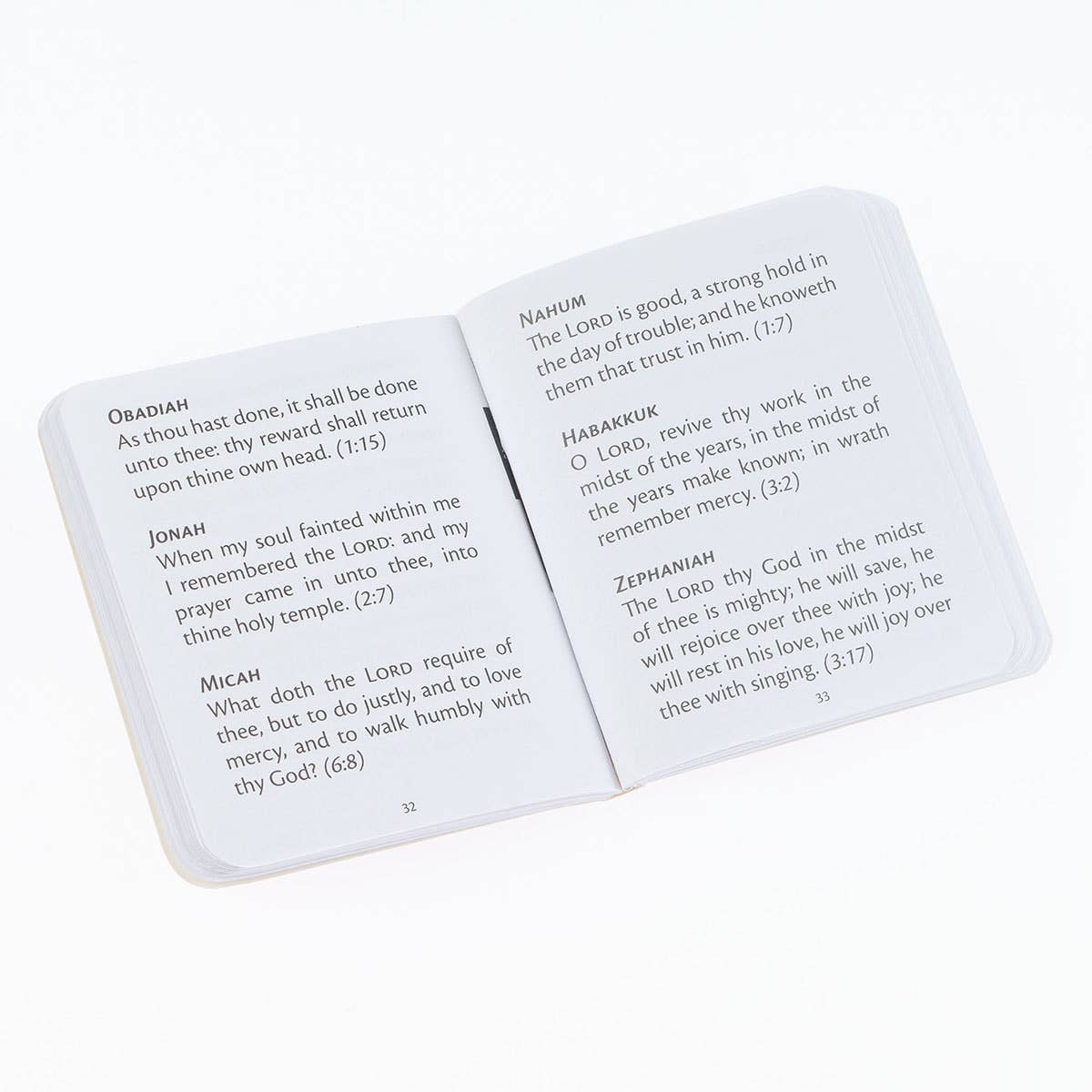 The White My Little Bible Illustrated Edition is a tiny booklet filled with the most important verses in each book from the KJV Bible, and it will make an endearing gift for a baptism or first communion. The white cover of the little booklet features a gold-foiled title and cross.My Little Bible  The small booklet that measures roughly 2" by 2" contains key verses from every book of the Bible. It's definitely not the whole Bible, but rather the Bible in a nutshell. Key verses from the Old and New Testaments are followed by a thematic Scripture finder index that helps you find verses about specific topics. The book ends with a section explaining who you are in Christ. 8 line-drawn images are added to the classic KJV text.  Celebrate your children's or grandchildren's spiritual milestones when you give the White My Little Bible - Illustrated Edition as a small reminder of their faith.