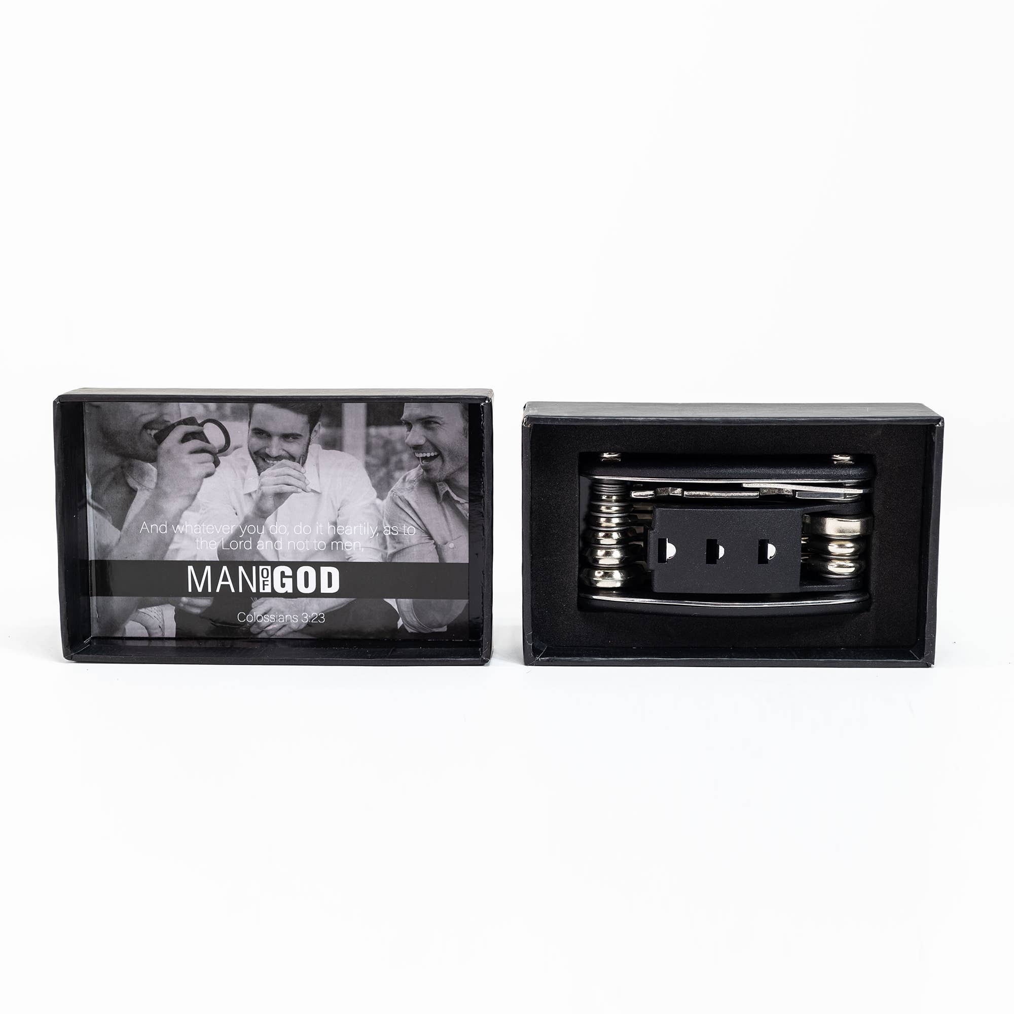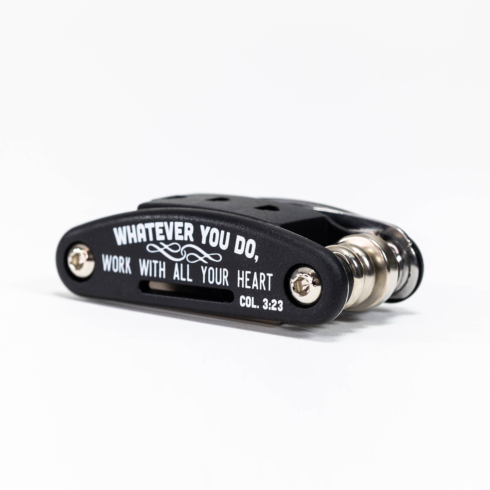 Scripture: Whatever you do, work with all your heart. Col. 3:23. This unique men's accessory is an all in one 14 hex key in a variety of sizes. Saturday stainless steel. Tools Included: 6 Alan keys, 2 Hex wrenches, 3 Sockets, 1 Phillips, & 1 flathead. The perfect addition to any tool box. The tool you never knew you needed.