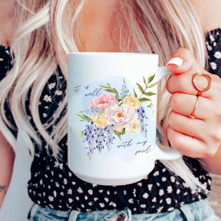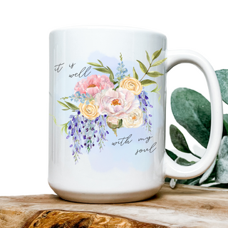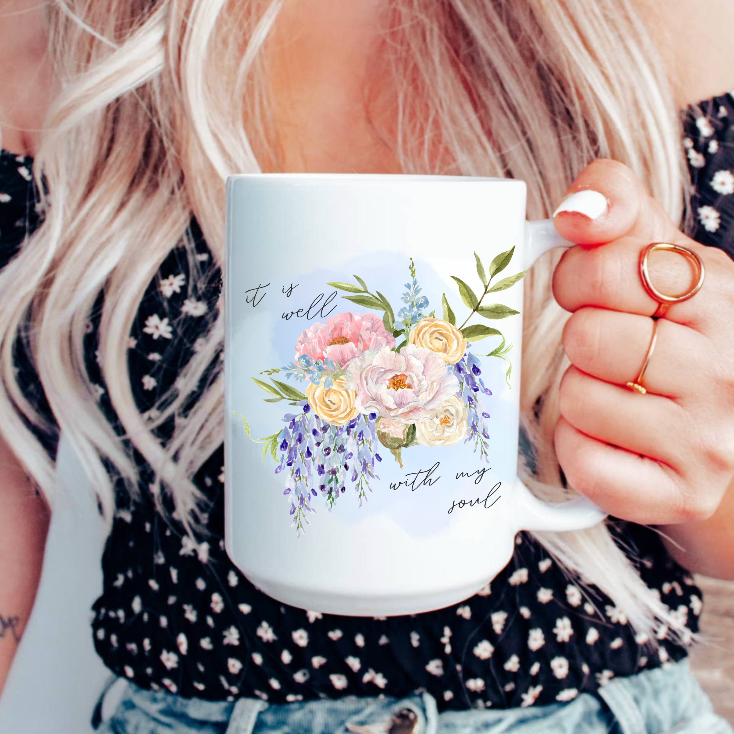 This new, cute Christian coffee mug will make a charming gift for you or a someone you love. Featuring a beautiful hand painted watercolor, spring flower floral bouquet with bright and colorful, wisteria, peony, roses and greenery.