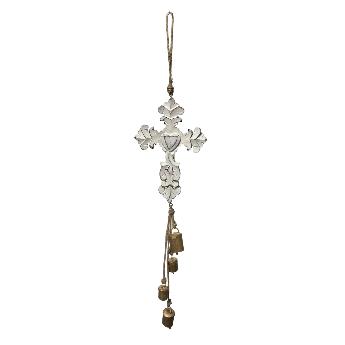 St. Valentine Wood Cross Hanging Chapel Bells Wind Chime. Whitewashed Wood. Burnished Gold Bells with Metal Clapper.