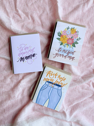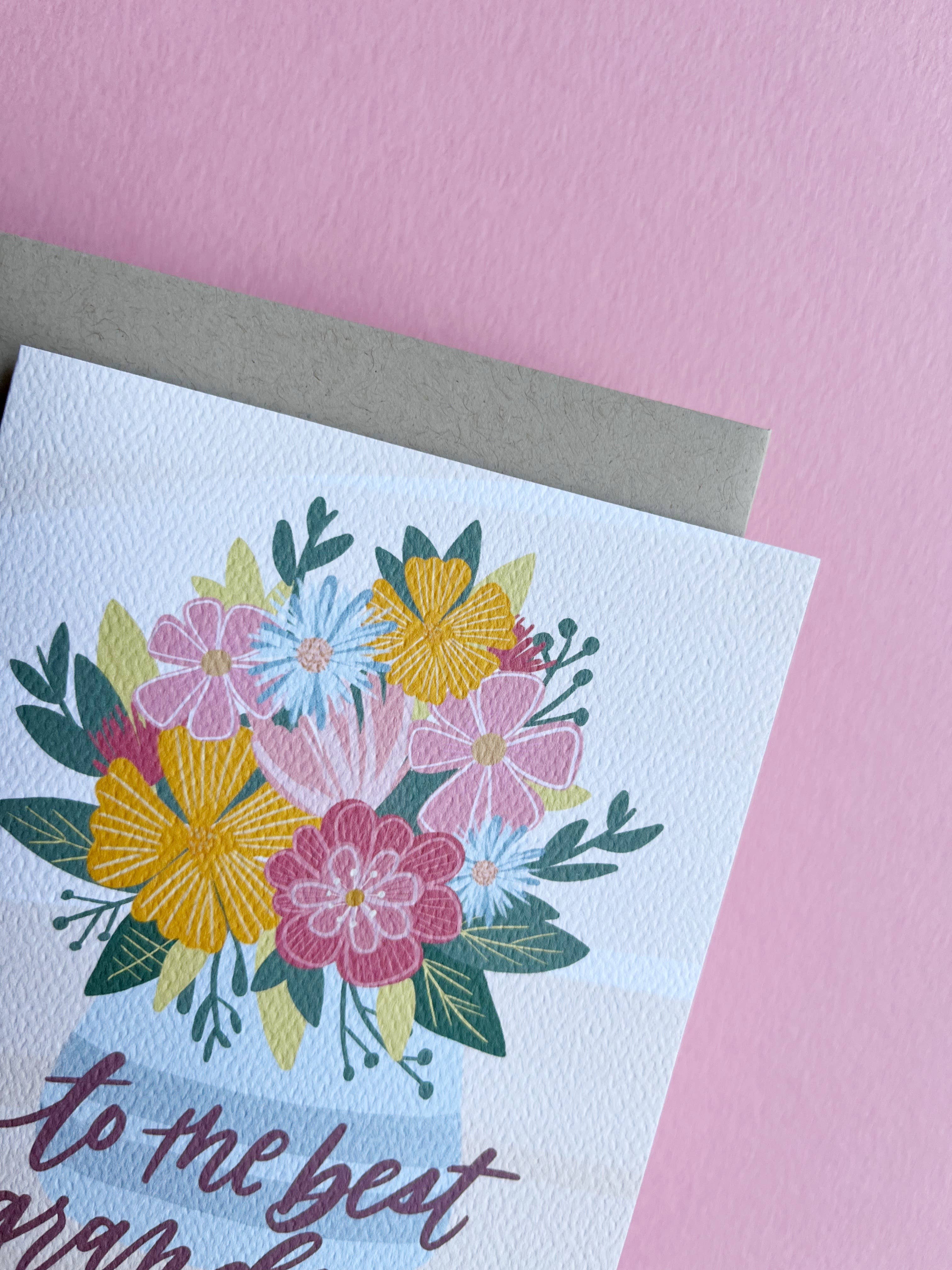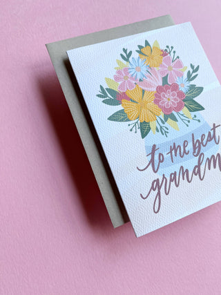 One of the most popular cards in my shop and for good reason! Grandmas make the world go 'round! From the extra care and love they give, to the special relationships they share, this card is the perfect greeting for the best grandmother in the world. Hand-lettered "To the best grandma" with a hand-drawn floral bouquet. For Mother's Day or everyday! Blank inside. Digitally printed on #110 felted white stock. A2 card with final dimensions of 4.25" x 5.5" Packaged with a beige Kraft envelope in a clear cello sleeve. Blank on the inside.