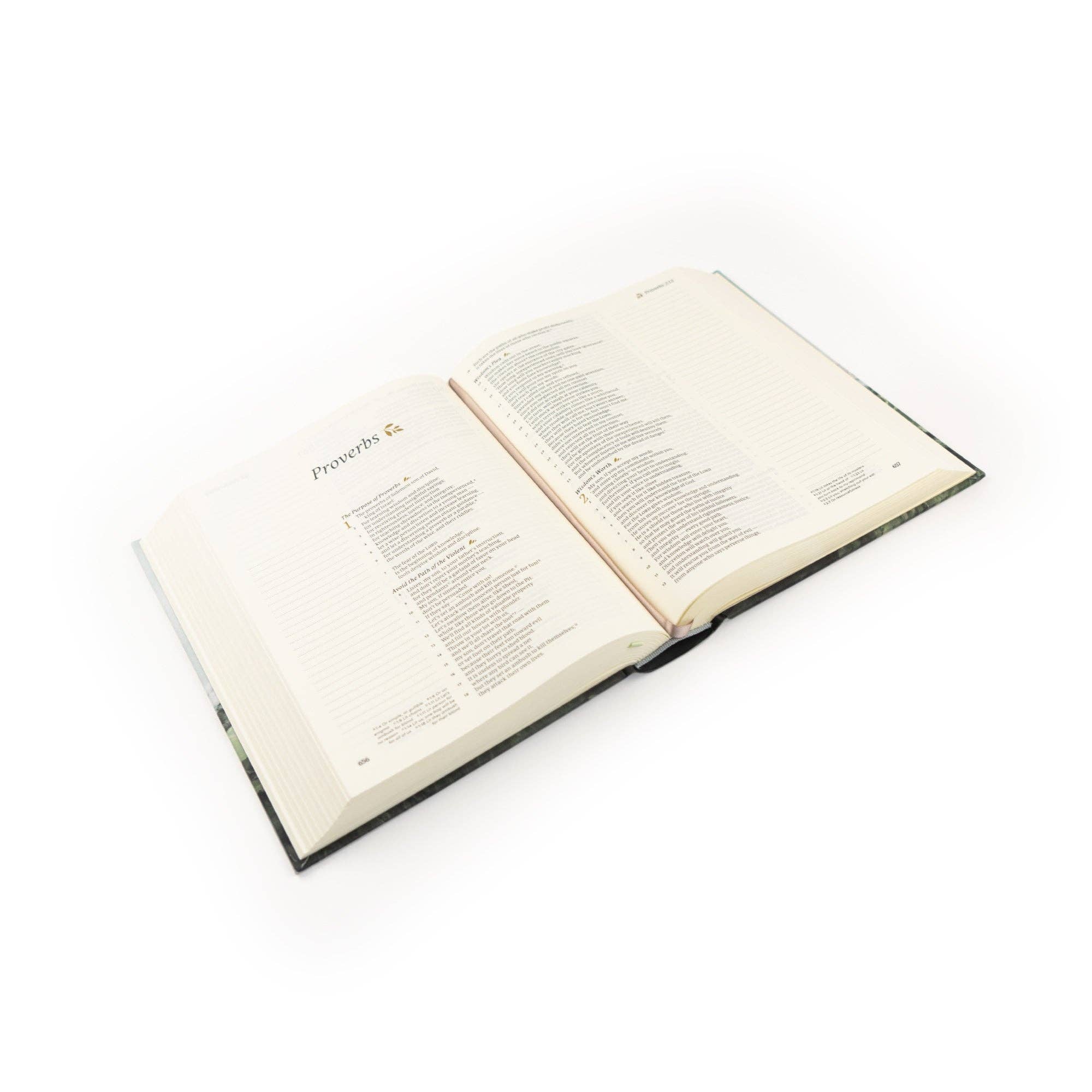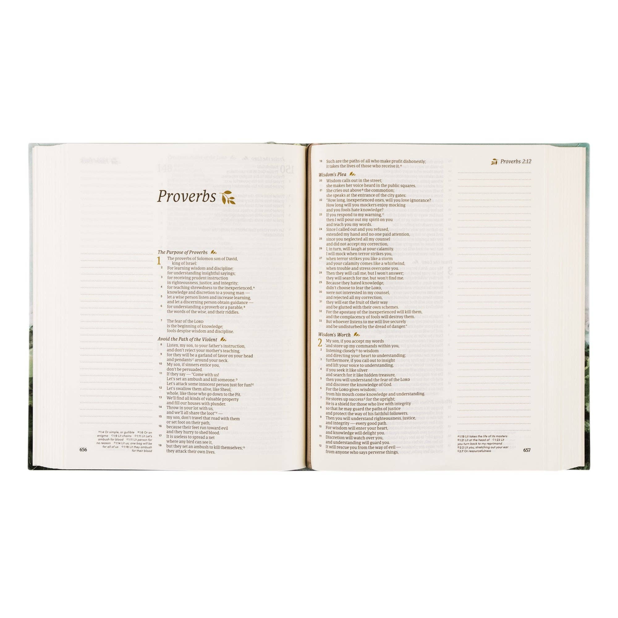 This breathtaking CSB Notetaking Bible features our beautiful Dublin design. Inspired by the countryside of Dublin, Ireland, this serene landscape invites you to experience the rest of God’s character. The rolling hills, lush greenery, and billowing clouds exude life, peace, and the resounding whisper of God’s glory. Nestled within the rolling hills are flocks of sheep, commonly used in the Bible to showcase our role as God’s children. The back of this Bible features the first verse from the beloved Psalm 23: “The Lord is my shepherd; I shall not want.” This verse is an invitation to surrender our fears and desire for control, knowing that we are in the hands of the most careful shepherd.