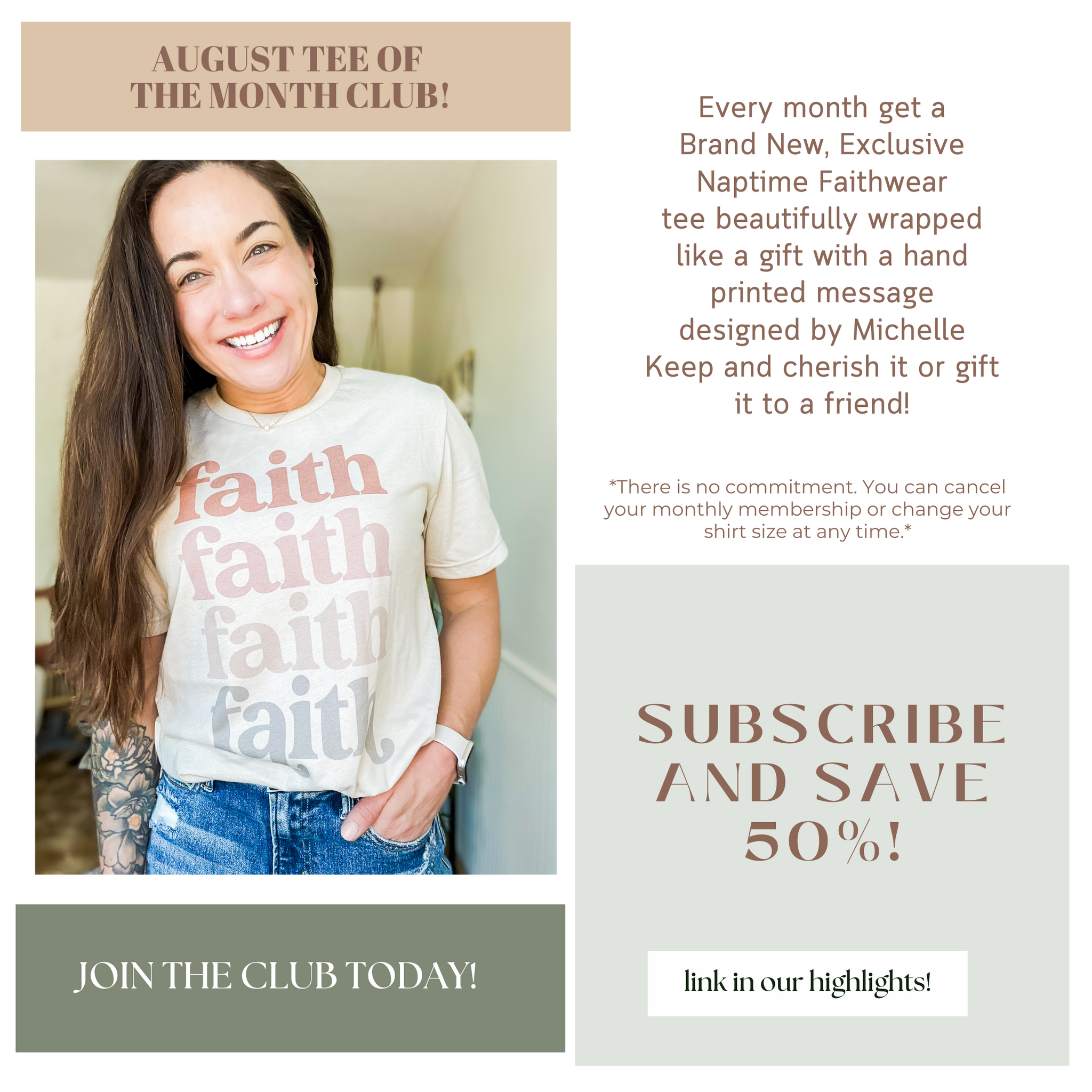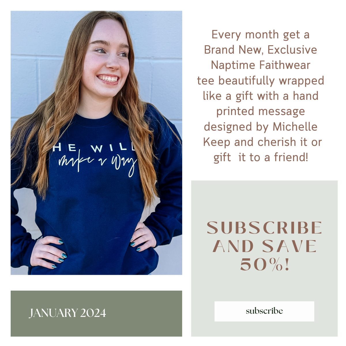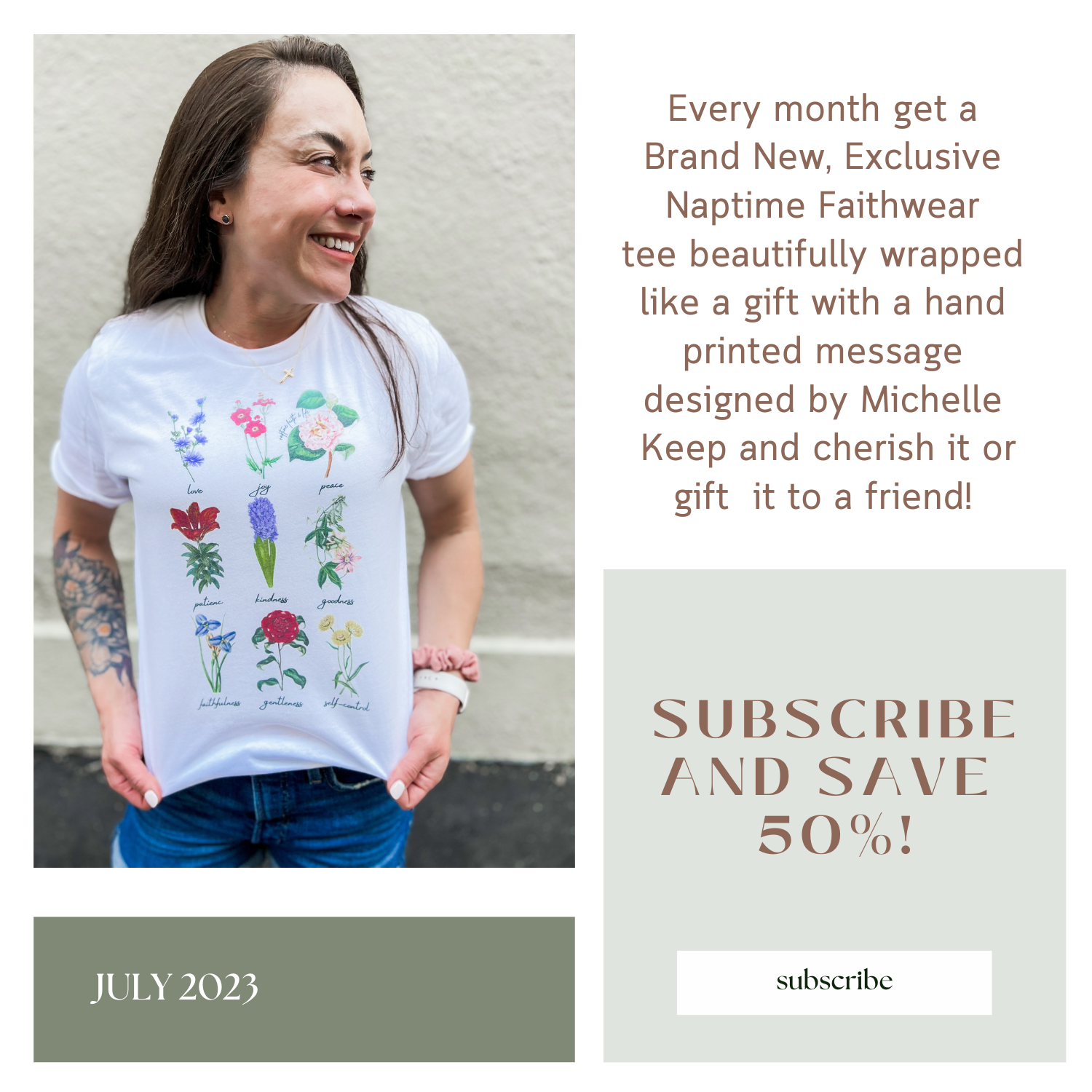 The Naptime Club Subscription Box is PERFECT for you! Every month get a Brand New, Exclusive Naptime Faithwear tee beautifully wrapped like a gift with a hand printed message designed by Michelle!