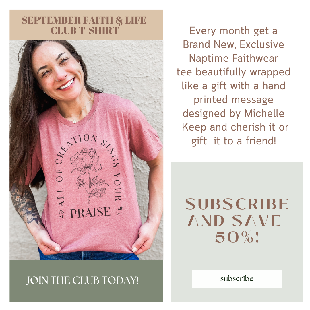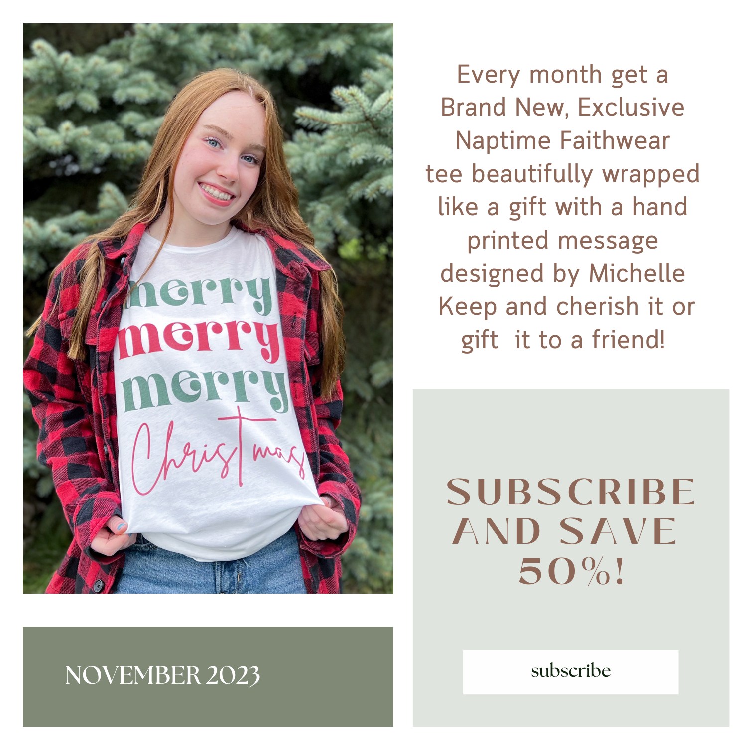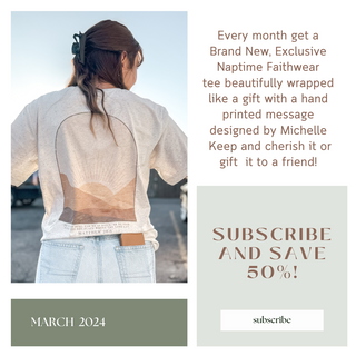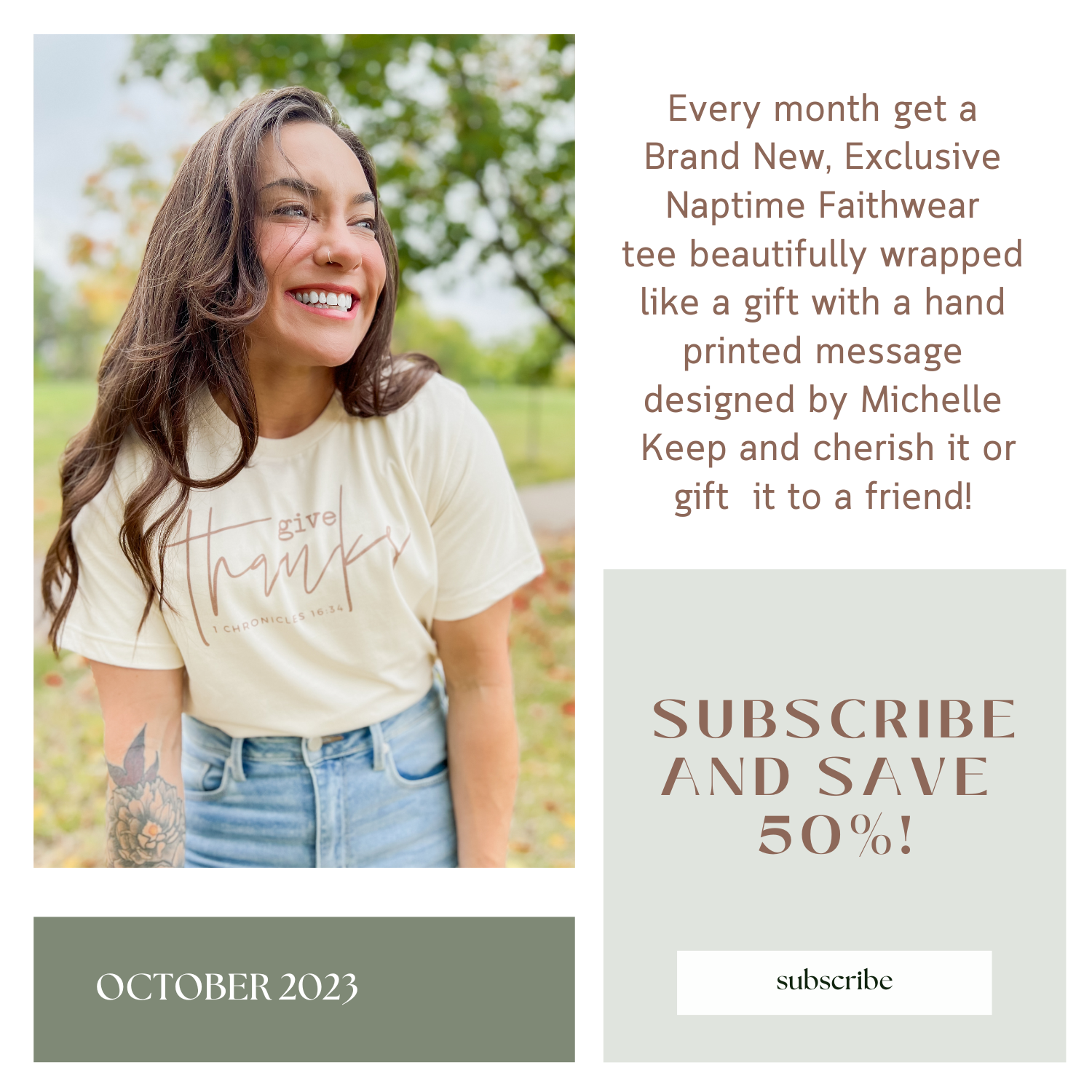 The Naptime Club Subscription Box is PERFECT for you! Every month get a Brand New, Exclusive Naptime Faithwear tee beautifully wrapped like a gift with a hand printed message designed by Michelle!