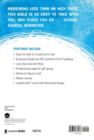 The NIV Bible for Kids: Large Print Thinline Edition is perfect for those looking for a convenient Bible size and a large, readable text for children. Including the NIV translation in an attractive leather-like binding, this Bible features the same convenient size, readability, features, and feel. Recommended for ages 8 to 12 years.