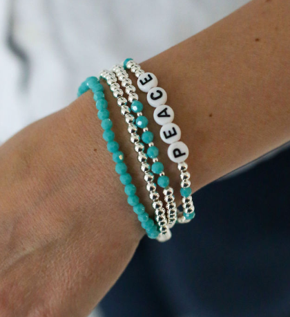 Peace Beaded Word Stack Bracelet. Three stackable bracelets with dipped 14k gold & grey stone beads. *not available for customization*