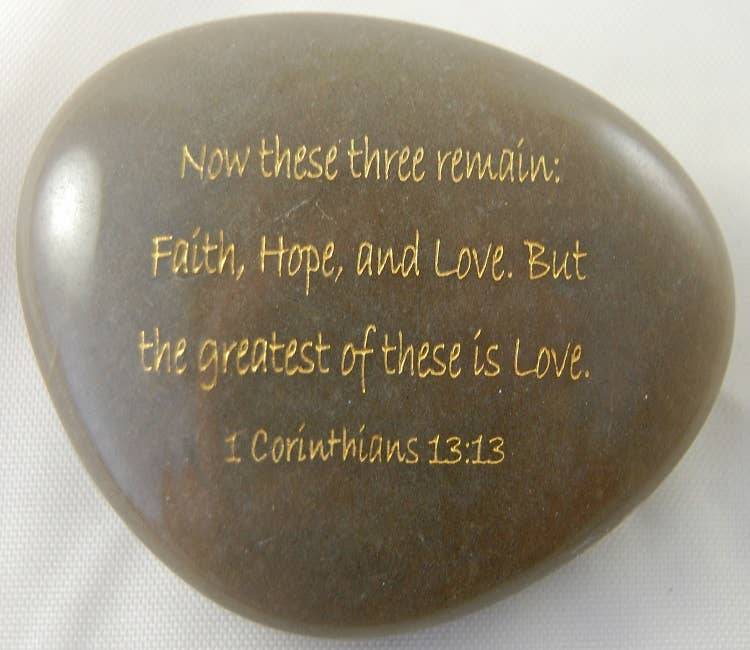 Scripture river rocks (2 1/2" - 3"). Stones will come in assorted earth tone colors with gold ink. Now these three remain; Faith, Hope, and Love. But the greatest of these is Love. 1 Corinthians 13:13 One of our most popular items. These river rocks are beautifully engraved in gold ink and are a great way to display a favorite scripture. They make great gifts, party favors, and counter add-ons.