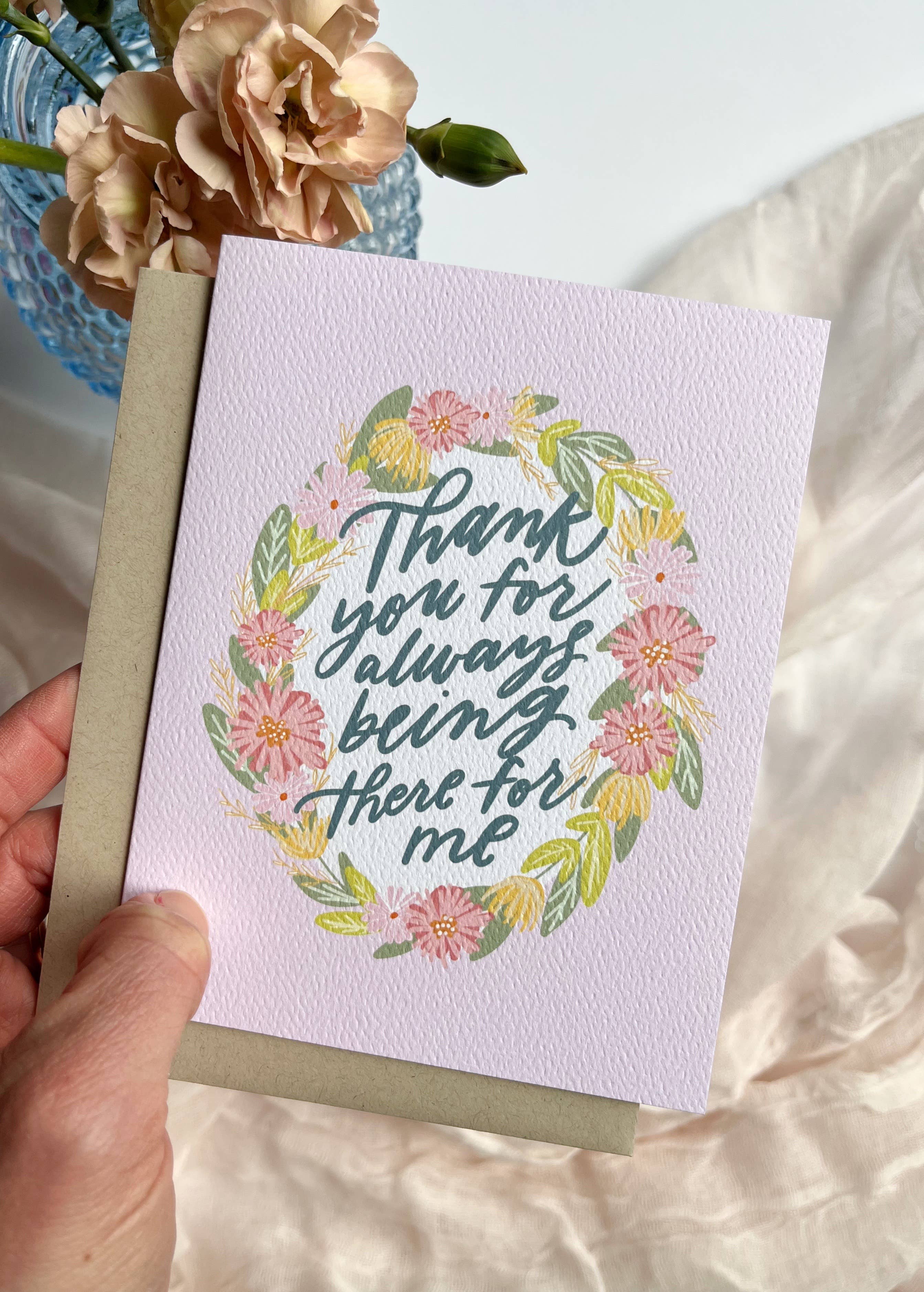 We all have moments when we need more help than we can offer. This greeting card is the perfect offer to someone who is always there, always looking out for you, always lending a hand, and always going the extra mile to support you. A thank you note for when "thank you" just isn't enough, this is the perfect addition to any card stash. "Thank you for always being there for me" within a hand-illustrated wreath. Digitally printed on #110 felted white stock. A2 card with final dimensions of 4.25" x 5.5" Packaged with a beige Kraft envelope in a clear cello sleeve. Blank on the inside.